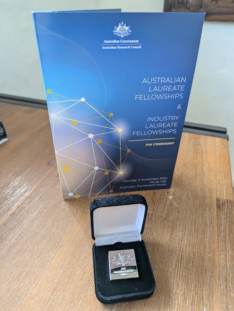 Last week I had the honour of attending the ARC’s annual Laureate Pin Ceremony, celebrating Australian Laureate Fellowship recipients and Industry Laureate Fellowship recipients. It was wonderful to celebrate with family and meet old and new colleagues. I received my pin in Australia’s Parliament House in Canberra from the Federal Member for Canberra, Ms Alicia Payne MP.